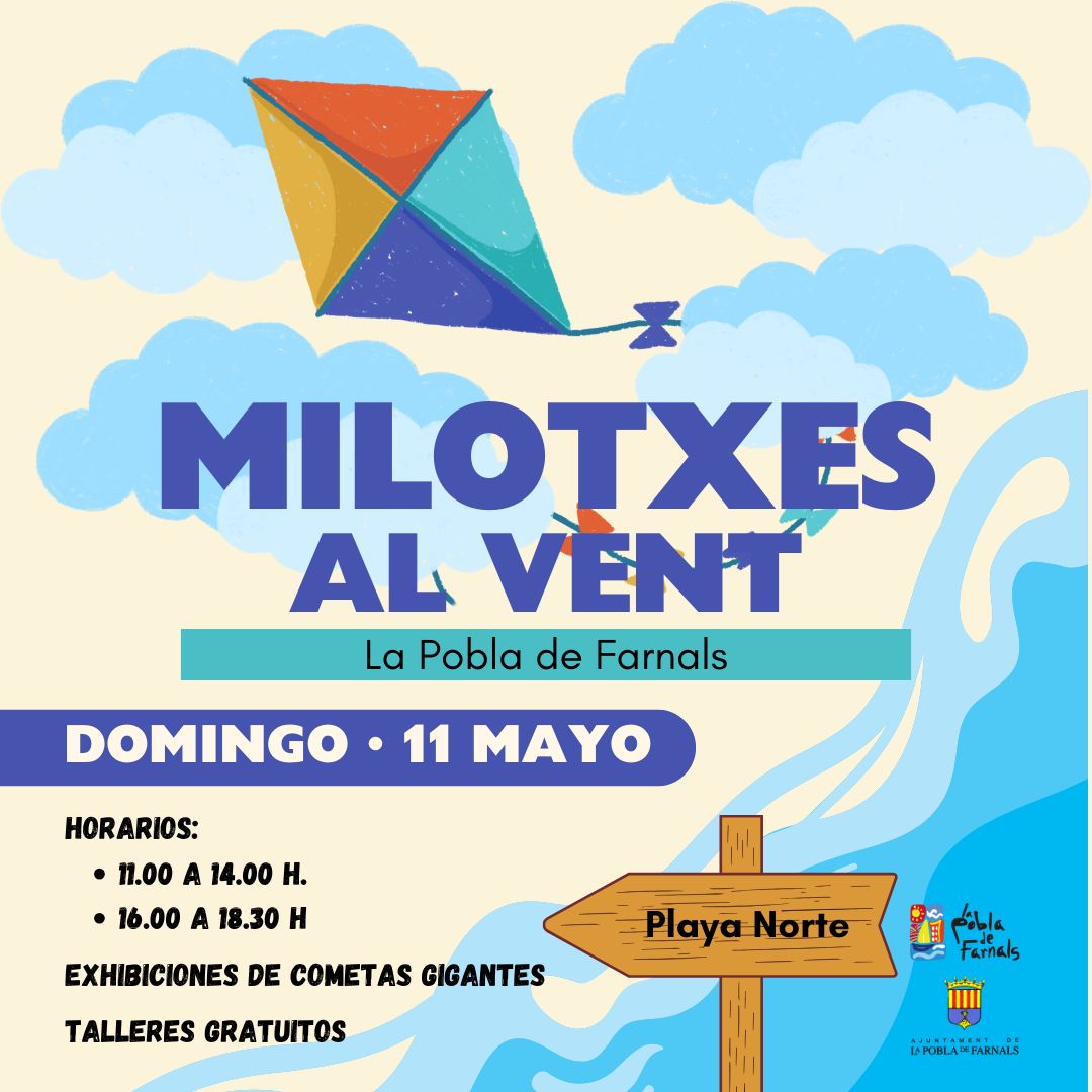 La playa de La Pobla de Farnals acoge una nueva edición de Milotxes al vent, una jornada lúdica y familiar dedicada al mundo de las cometas. El evento se celebrará el domingo 11 de mayo en el entorno del Paseo Colón y la Playa Norte, en horario de 11:00 a 14:00 h y de 16:00 a 18:30 h