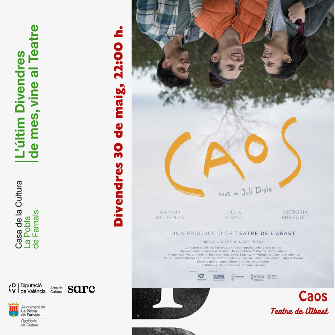 Tres jóvenes se enfrentan a sus primeras experiencias laborales en un mundo que a menudo parece contradictorio y confuso. A través de situaciones que oscilan entre la comedia y el drama, Caos retrata la incertidumbre de una generación que lucha por encontrar su lugar en una sociedad en constante cambio. Con texto de Juli Disla y dirección de José Puchades (Txuka), el espectáculo combina teatro físico, música y mucho ritmo para hacer reflexionar y emocionar al público.