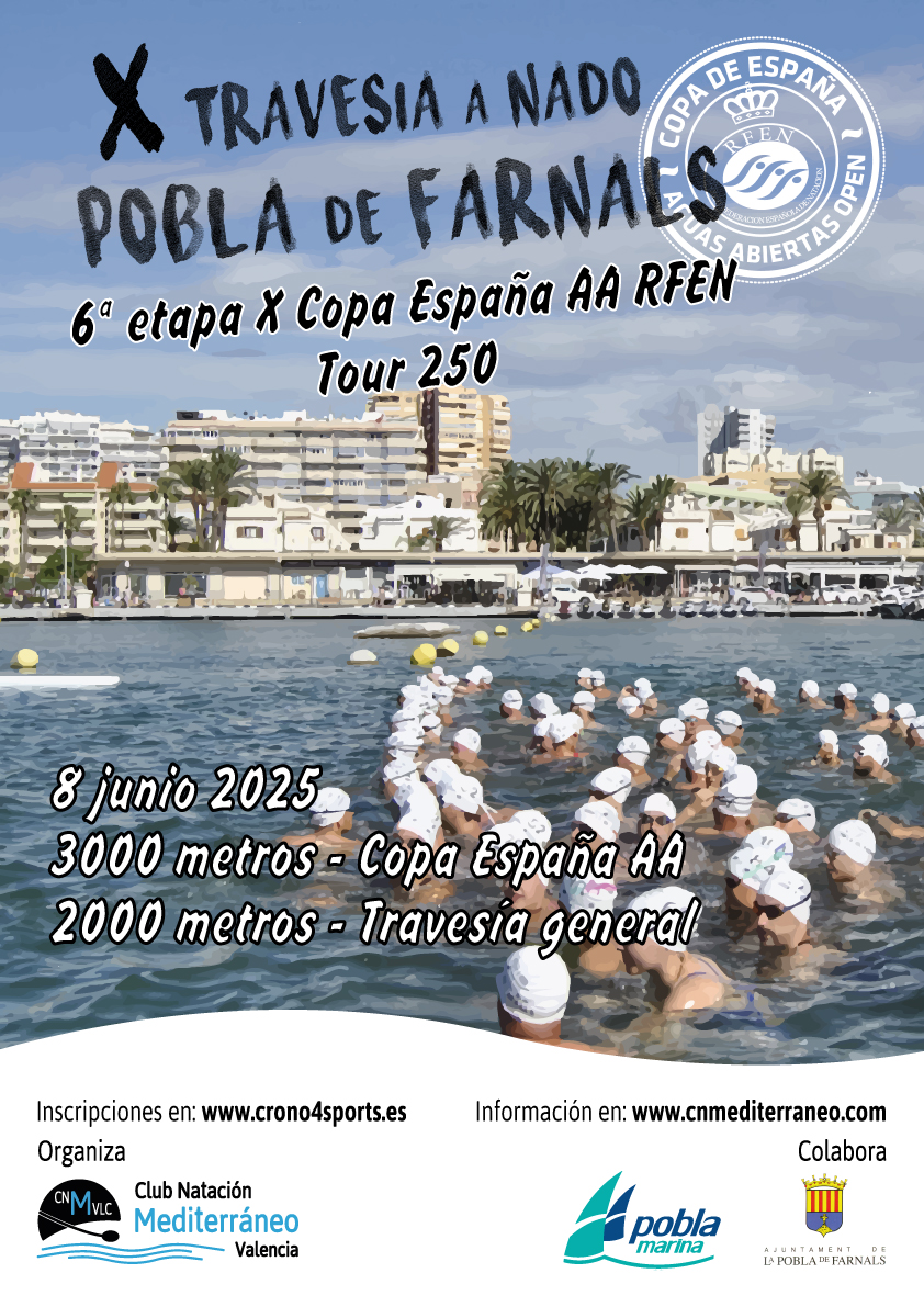 El 8 de junio de 2025 se celebrará la X Travesía a Nado Pobla de Farnals, una cita ya consolidada en el calendario deportivo de aguas abiertas a cargo del Club Natación Mediterráneo Valencia. Este año, la prueba alcanza su décima edición y formará parte de la 6.ª etapa de la X Copa de España de Aguas Abiertas RFEN – Tour 250, lo que la convierte en una competición de referencia a nivel nacional.