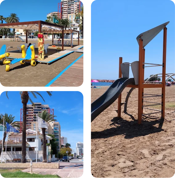 Además, Turisme Comunitat Valenciana instala un área de baño adaptado especialmente diseñada para el descanso. Esta estructura cuenta con asientos y un toldo, lo que permite a las personas disfrutar del agua mientras están protegidas del sol. Además, la estructura está equipada con un pasillo con barandillas, facilitando el acceso a la zona y a los canales de nado para personas con movilidad reducida.
